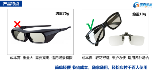 2、采用主流的圓偏振眼鏡(也稱不閃式),無環境光影響,不閃爍,無需充電,輕薄,成本低。