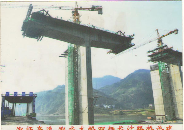 溆懷高速溆水大橋四標由長沙路橋承建,采用我公司HBT60-1616-90Es輸送泵一臺垂直泵送60米水平距離200米 C50砼實現成功澆注