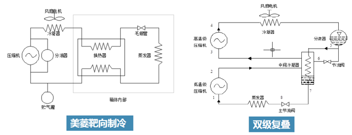 從圖中可看出,雙級復疊制冷系統分別由一級(高溫系統)和二級(低溫系統)組成,其中一級系統的作用是為二級系統的冷凝器降溫,而不是給冰箱內部降溫,是防止二級系統過熱和高壓。